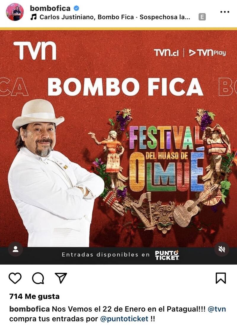 Bombo Fica es el humorista encargado del entregar la cuota de humor en la última jornada del Festival del Huaso de Olmué 2023, evento que es transmitido a través de las pantallas TVN y su señal online, la cual llega a 24 países.