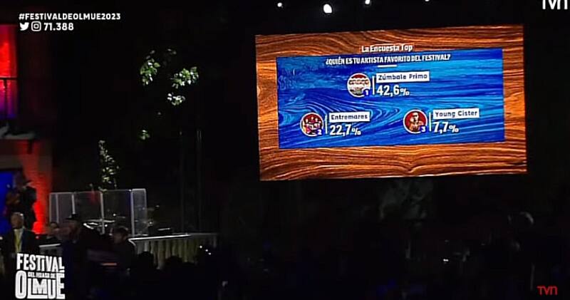 Los intérpretes de “Cinco días” obtuvieron un 42,6% de las preferencias, dejando muy por detrás a la otra sorpresa del certamen, el grupo de cueca Entremares, que se quedó con el segundo lugar con un 22,7%, y mucho más atrás estuvo Young Cister con un 7,7% de las preferencias.