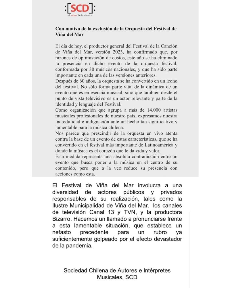 “Como organización que agrupa a más de 14.000 artistas musicales profesionales de nuestro país, expresamos nuestra incredulidad e indignación ante un hecho tan significativo y lamentable para la música chilena. Nos parece que prescindir de la orquesta en vivo atenta contra la base de un evento de estas características, que se ha convertido en el festival más importante de Latinoamérica y donde la música es el corazón que le da vida y valor", se menciona en el comunicado oficial de SCD.