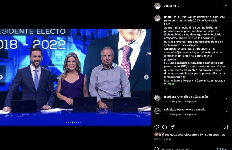 En su mensaje, Daniel Matamala aclaró que tomó esta decisión, pues se le había hecho "difícil compatibilizar mi presencia en el panel con la conducción de 'Chilevisión Noticias' los domingos".