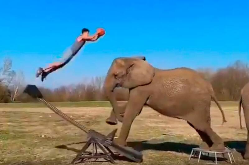 Un joven basquetbolista se ha convertido en viral gracias a un genial punto que realizó gracias a la ayuda de un elefante, que lo impulsó para hacerlo volar y anotar.