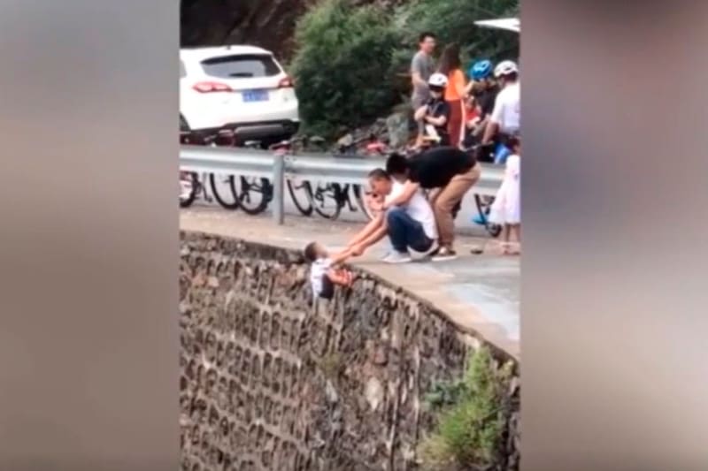 Una insólita escena se vivió en un mirador en la capital china Pekín, cuando unos padres tomaron a su hijo de los brazos de forma peligrosa en un acantilado, sólo para tomarle una foto. Una conducta peligrosa que fue grabada y viralizada en redes sociales.