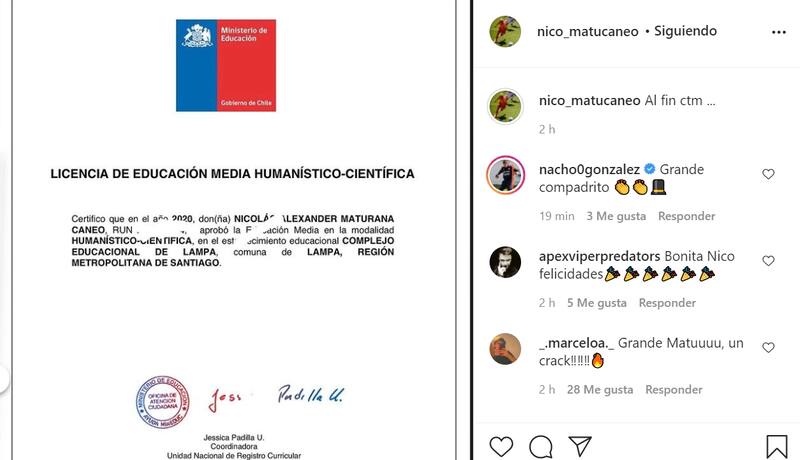 Nicolás Maturana se mostró feliz en su cuenta de Instagram luego de aprobar la enseñanza media a sus 27 años, en una muestra de superación importante, tanto en lo profesional como en lo personal en una carrera llena de obstáculos que hasta ahora tienen al exjugador de Colo Colo cumpliendo uno de sus grandes metas.