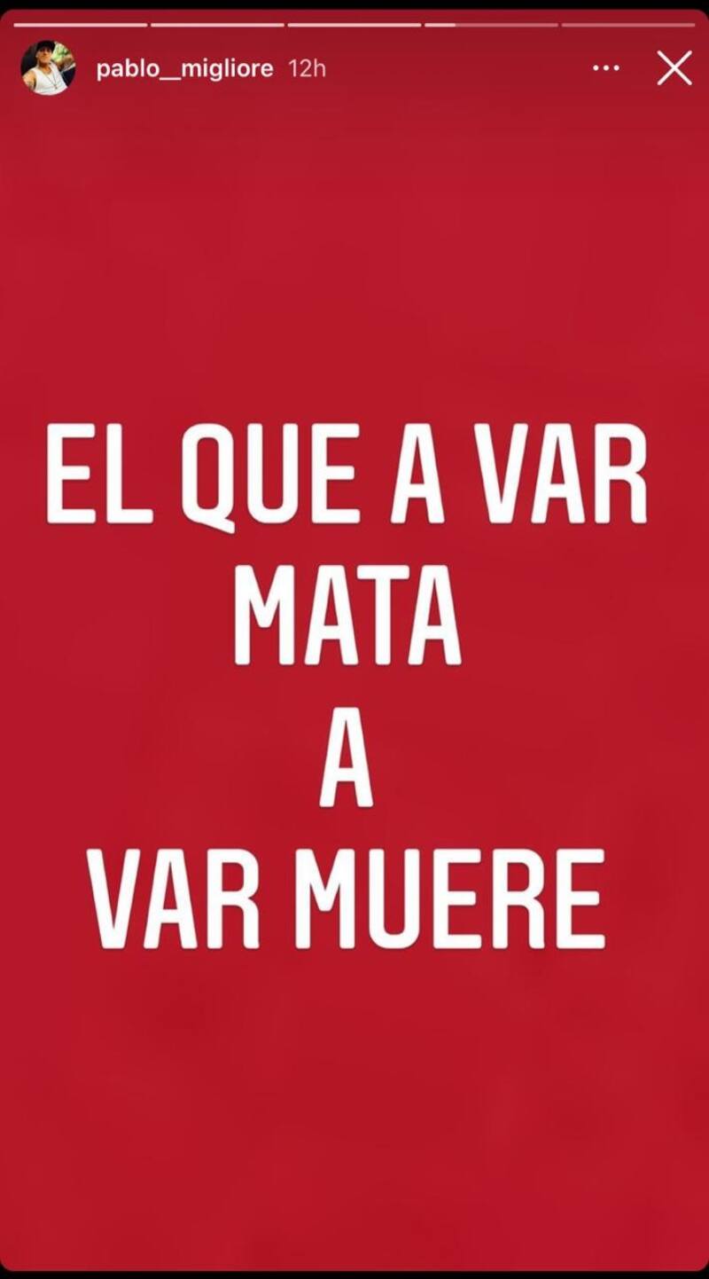 “El que a VAR mata a VAR muere”, escribió el arquero y reconocido fanático de Boca en sus historias de Instagram, con letras blancas sobre un fondo rojo que hacen alusión a los colores que viste su archirrival.