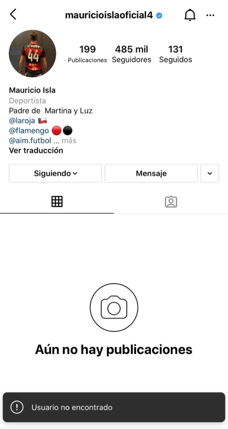 Esta tarde, el jugador del Flamengo, Mauricio "Huaso" Isla, desapareció de las redes sociales. Al buscar su nombre en Instagram, la cuenta oficial del chileno aparece no encontrada.