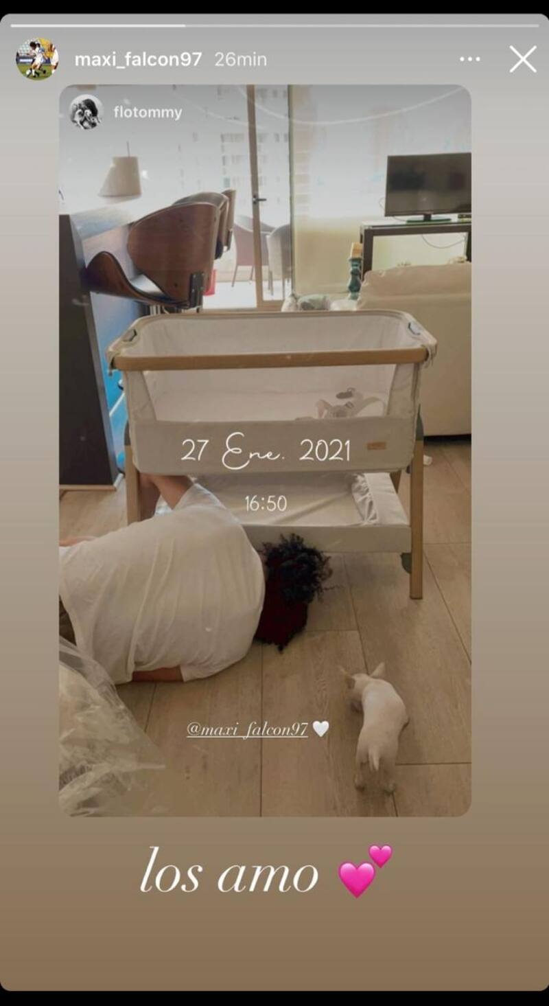 En sus historias de Instagram, la novia del "Peluca" subió una fotografía que fue reposteada por el jugador, donde se le ve armando la cuna de su bebé. "Los amo" escribió.