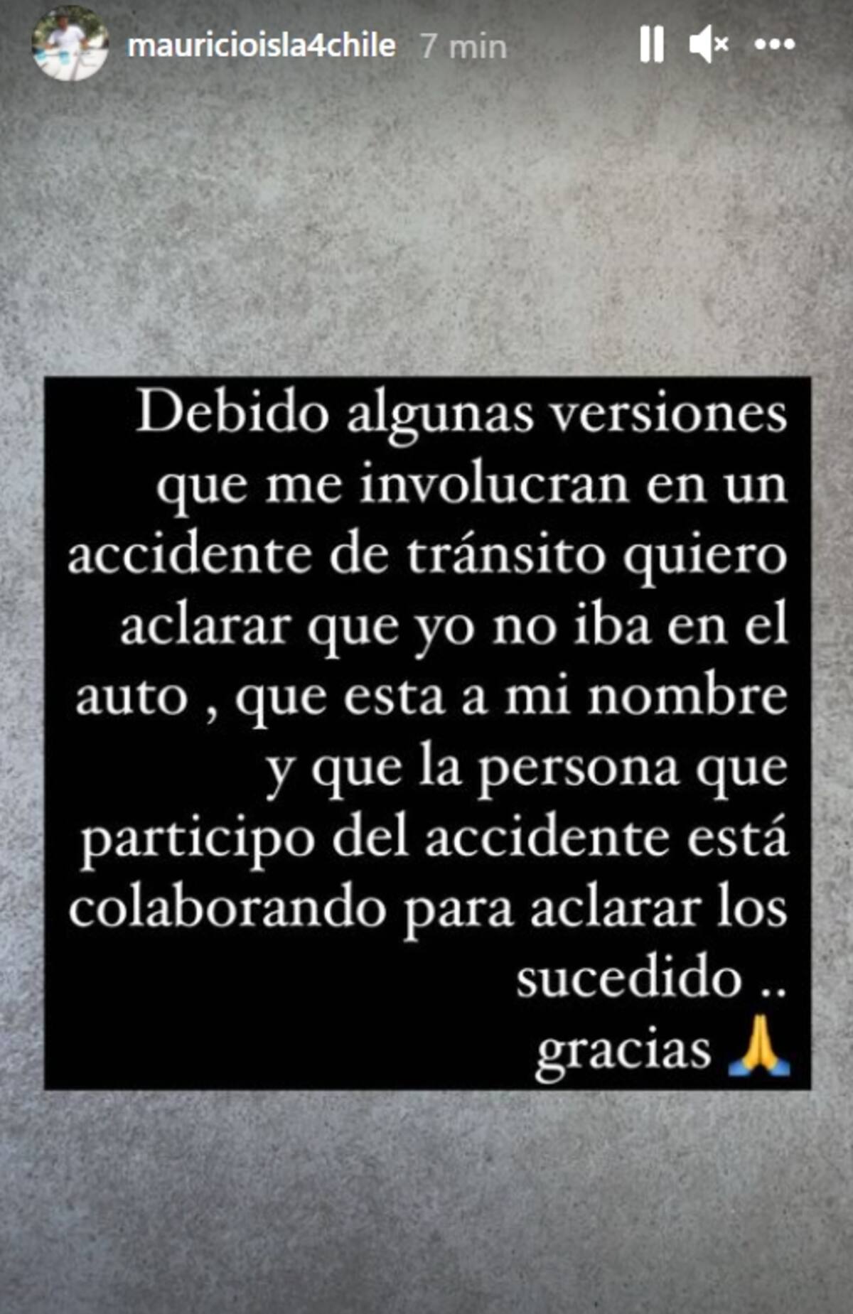 Esta mañana, el supuesto involucrado en la situación, negó su participación. A través de su Instagram, Mauricio Isla aseguró que él no manejaba el vehículo de alta gama que provocó el accidente en la Autopista Central de Santiago.