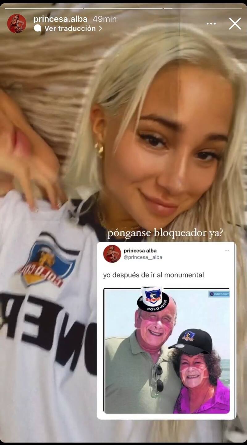 En una historia de Instagram, la influencer e hincha alba subió un corto video donde aparece ella en modo selfie posando con la camiseta de Colo Colo y abajo añadió una petición dedicada a los fanáticos del "Popular". "¿Pónganse bloqueador ya?", escribió junto a la grabación.