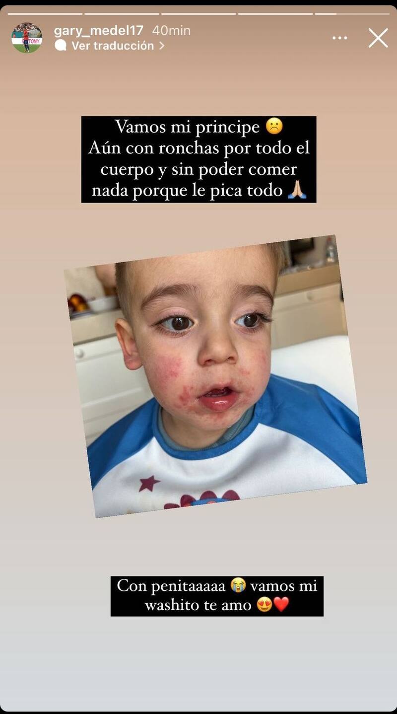 Después, compartió una fotografía donde aparece el pequeño de sólo dos años con su cara llena de sarpullido, "Vamos mi príncipe. Aún con ronchas por todo el cuerpo y sin comer nada porque le pica todo. Con penita, vamos mi washito te amo", escribió junto al otro posteo.