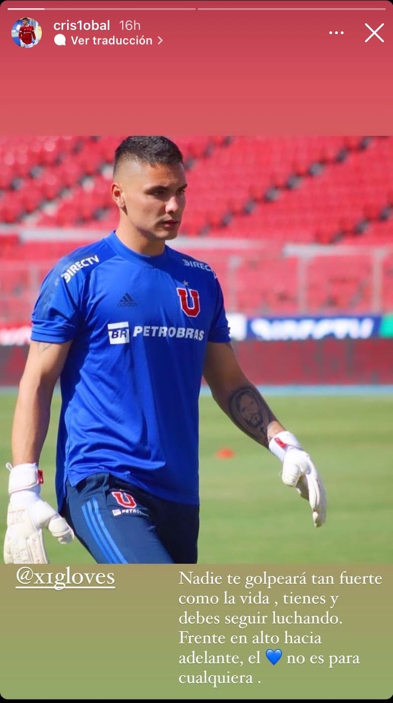 El arquero formado en la U, compartió un mensaje en sus redes sociales en medio de su negociación con la dirigencia del club. Junto a una fotografía suya dentro del campo de juego, el joven Azul escribió: "Nadie te golpeará tan fuerte como la vida, tienes y debes seguir luchando. Frente en alto hacia adelante, el corazón (Emoji de corazón azul) no es para cualquiera".