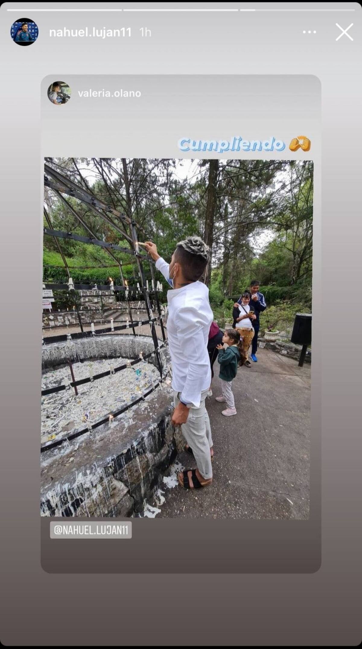 En sus redes sociales, el jugador de la U compartió unas fotografías y mostró a sus seguidores que se encontraba en un santuario agradeciendo a la Virgen. "Agradecerte siempre", escribió junto a la publicación y luego, reposteó otra captura tomada por su esposa, donde él aparece de camisa blanca prendiendo velas. "Cumpliendo", escribió Valeria.