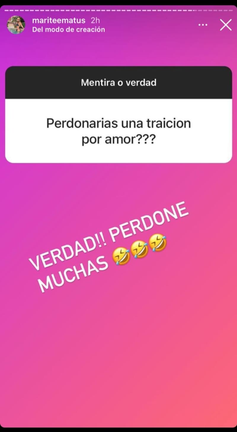 Entre las preguntas, uno de los usuarios le escribió "¿perdonarías una traición por amor?", a lo que contestó "Verdad, perdoné muchas", junto a unos emojis de caras riéndose. Con la confesión dio a entender a sus seguidores que en más una ocasión dejó pasar infidelidades al "Rey" de la Selección Chilena.