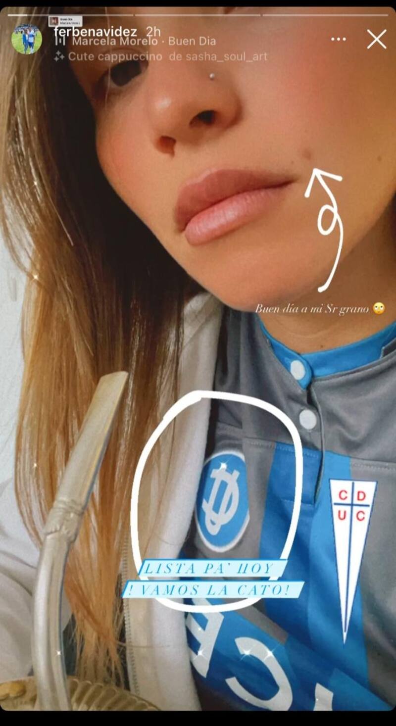 Por otro lado, Fernanda Benavides, casada con su 'tocayo', el delantero de la "Franja", compartió una selfie suya tomando mate, vistiendo la camiseta del cuadro "Cruzado", señalando la insignia con un círculo blanco y escribiendo "Lista pa' hoy ¡Vamos la cato!".