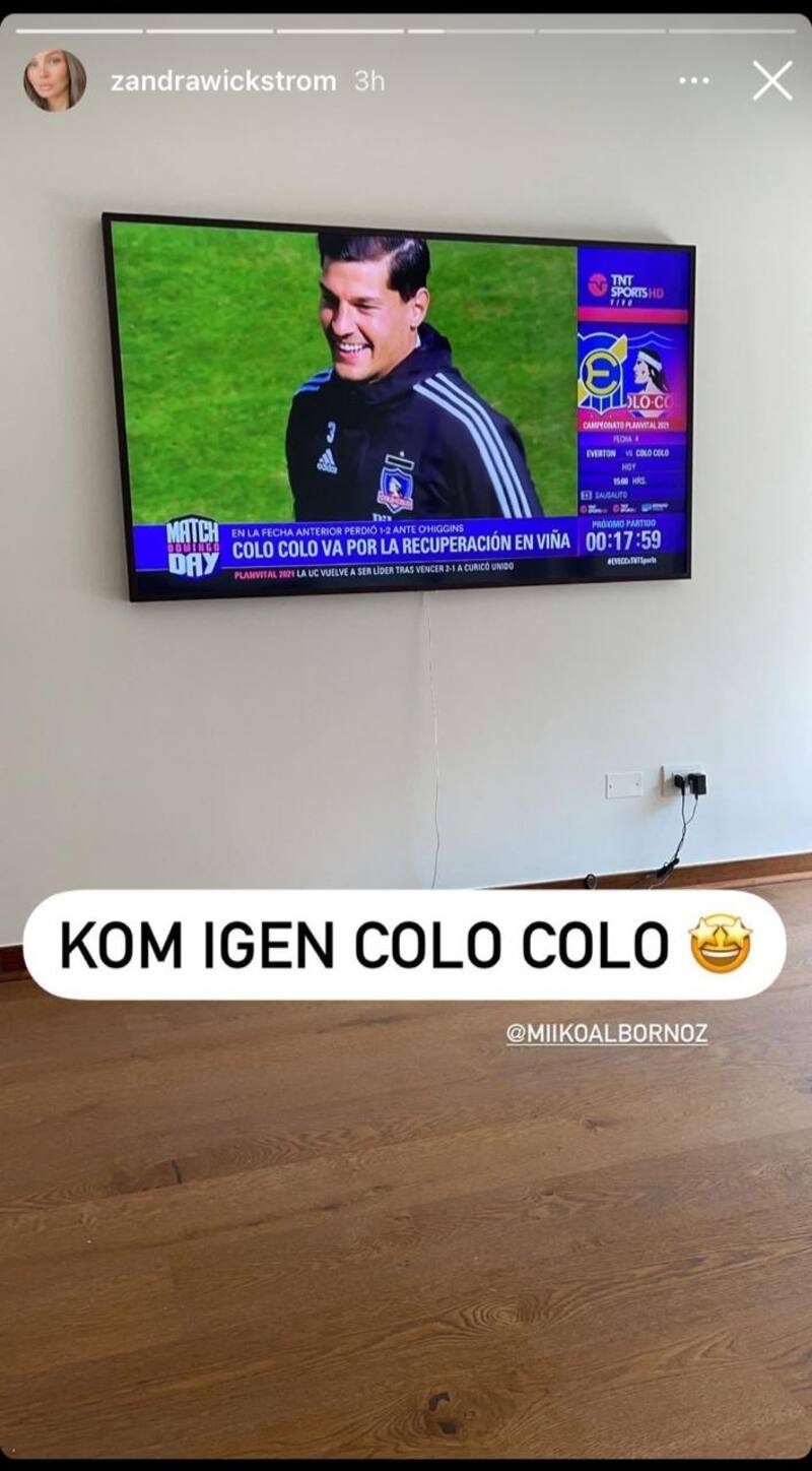 En las imágenes mostró la pantalla de su televisión mientras veía el encuentro del "Cacique". "Vamos Colo Colo", escribió en sueco sobre la imagen.