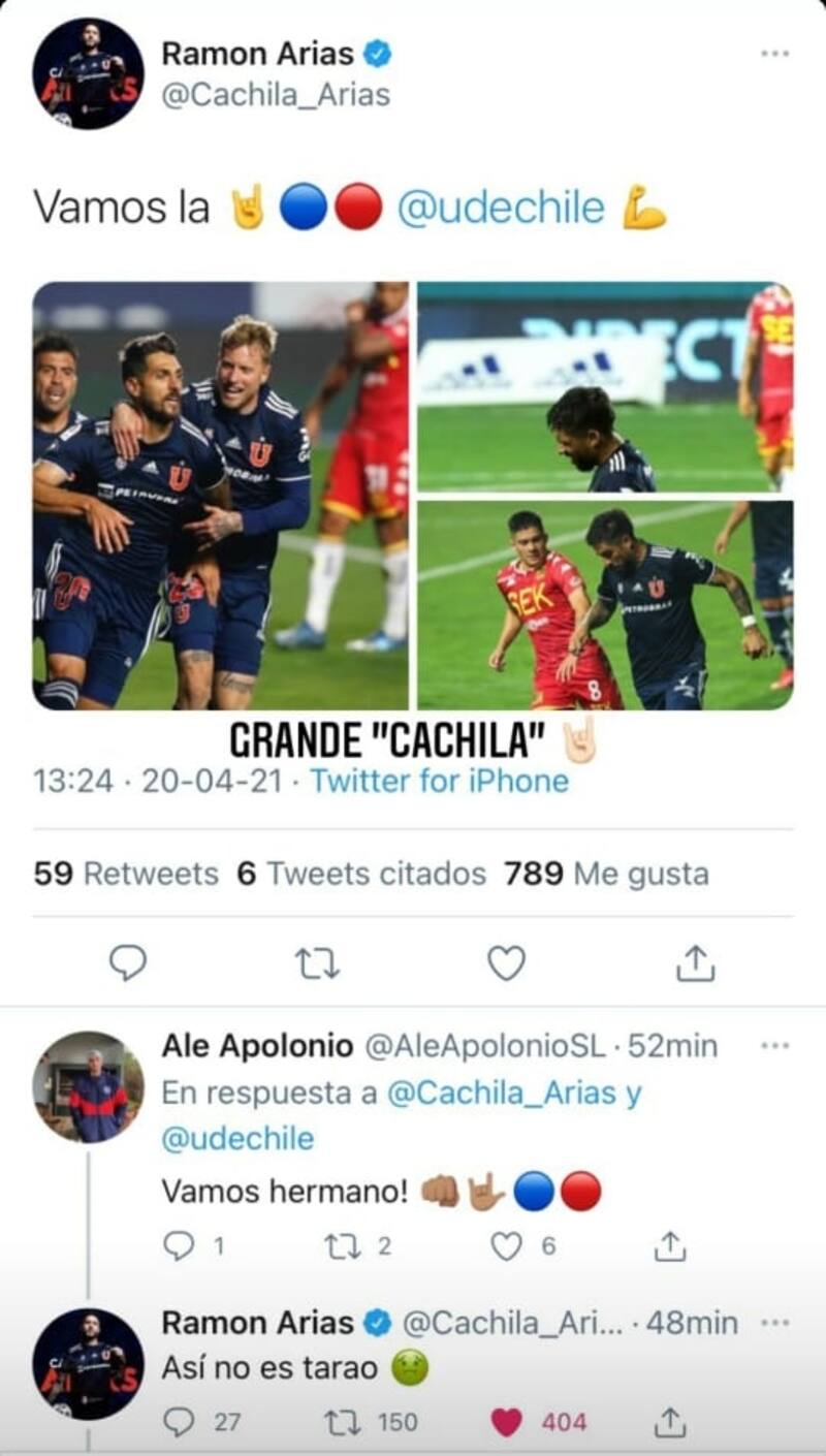 Tras el primer triunfo de Universidad de Chile en el Campeonato Nacional 2021, el defensa uruguayo Ramón Arias celebró la obtención de los tres puntos ante Unión Española a través de Twitter, donde publicó tres fotografías de la jornada que se vivió anoche en el estadio El Teniente de Rancagua.