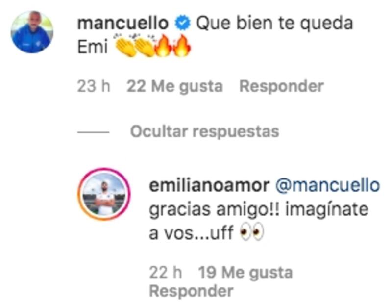 Uno de sus compañeros en Vélez Sarsfield, el argentino Federico Mancuello, le escribió un particular halago en la publicación. "Que bien te queda Emi", comentó sobre la indumentaria. Rápidamente Amor le respondió y le realizó una propuesta que llamó la atención de sus seguidores.