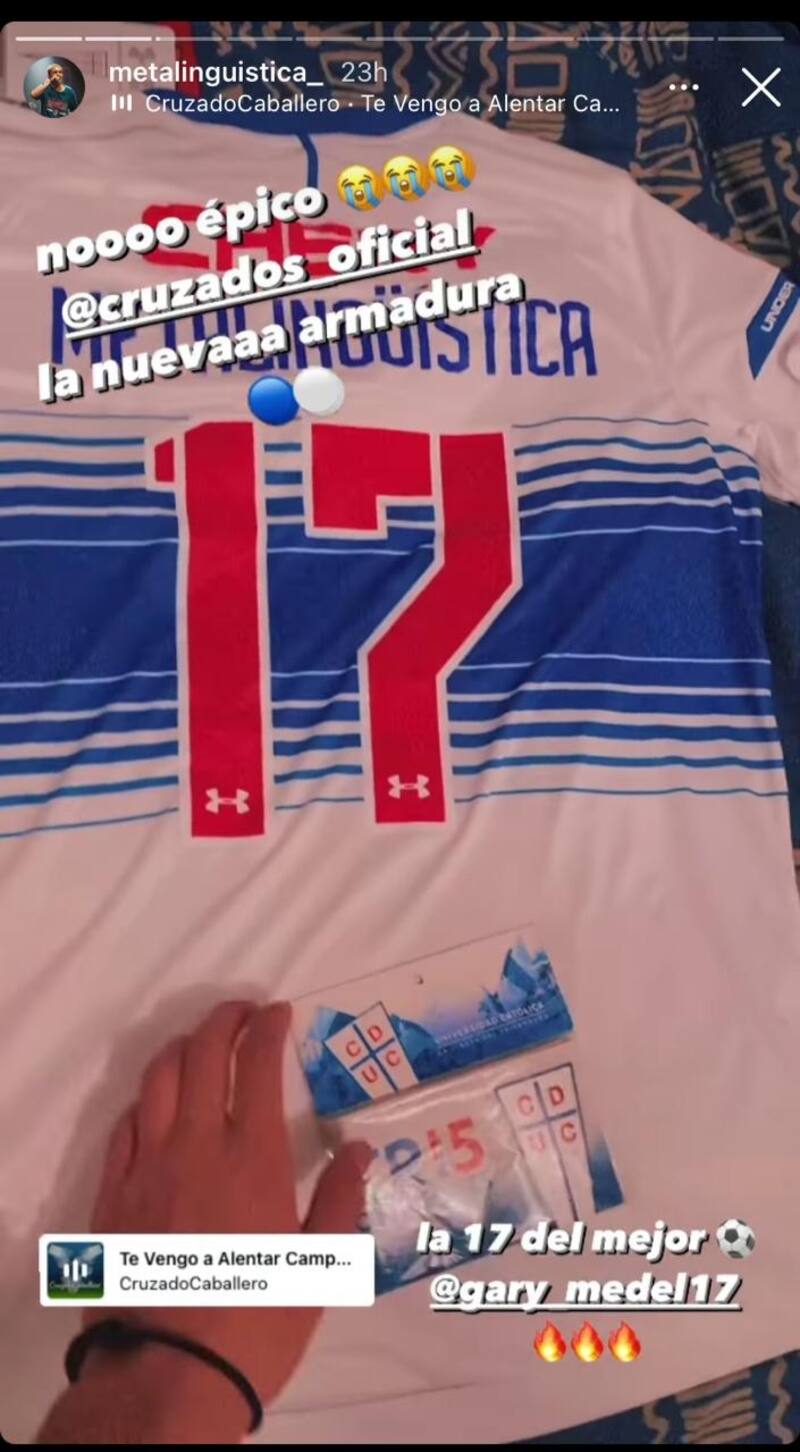 "Noo épico @cruzados_oficial la nueva armadura", escribió junto a unos emojis de cara llorando. "La 17 del mejor @gary_medel17", continuó, mostrando la indumentaria que le llegó a su casa, con el número de Gary Medel y su nombre escrito en la espalda.