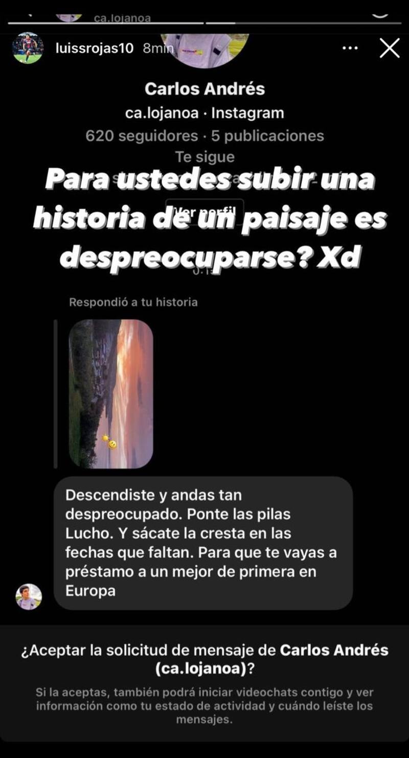 Una cuenta de Instagram respondió la historia de Rojas y le escribió: "Descendiste y andas tan despreocupado. Ponte las pilas Lucho y sácate la cresta en las fechas que faltan para que vayas a préstamo a un mejor equipo de primera en Europa".