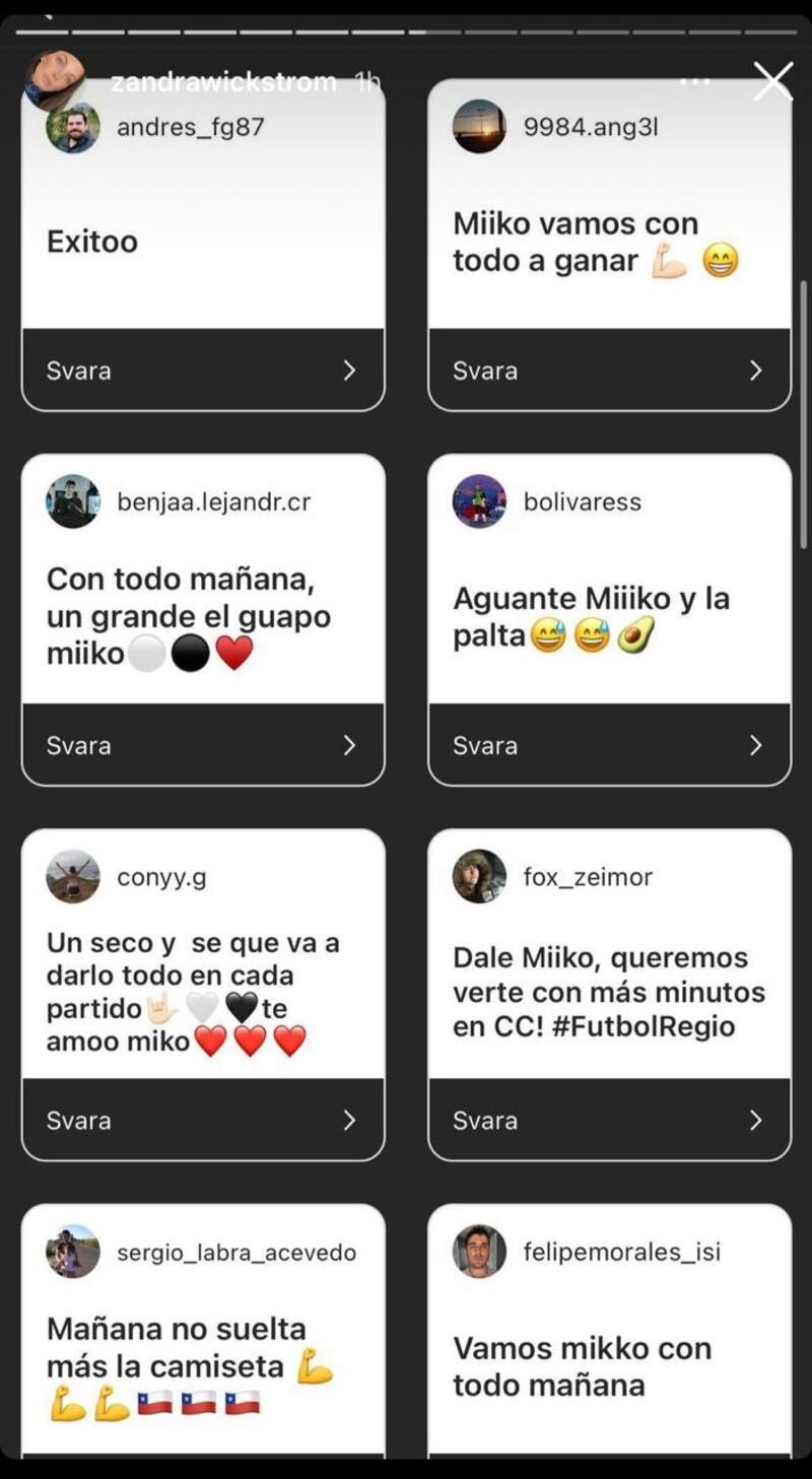 Esta mañana, la novia del jugador de Colo Colo Miiko Albornoz, Zandra Wickström, dejó que sus seguidores en las redes sociales le enviaran mensajes al chileno antes de su debut como titular junto al "Cacique".