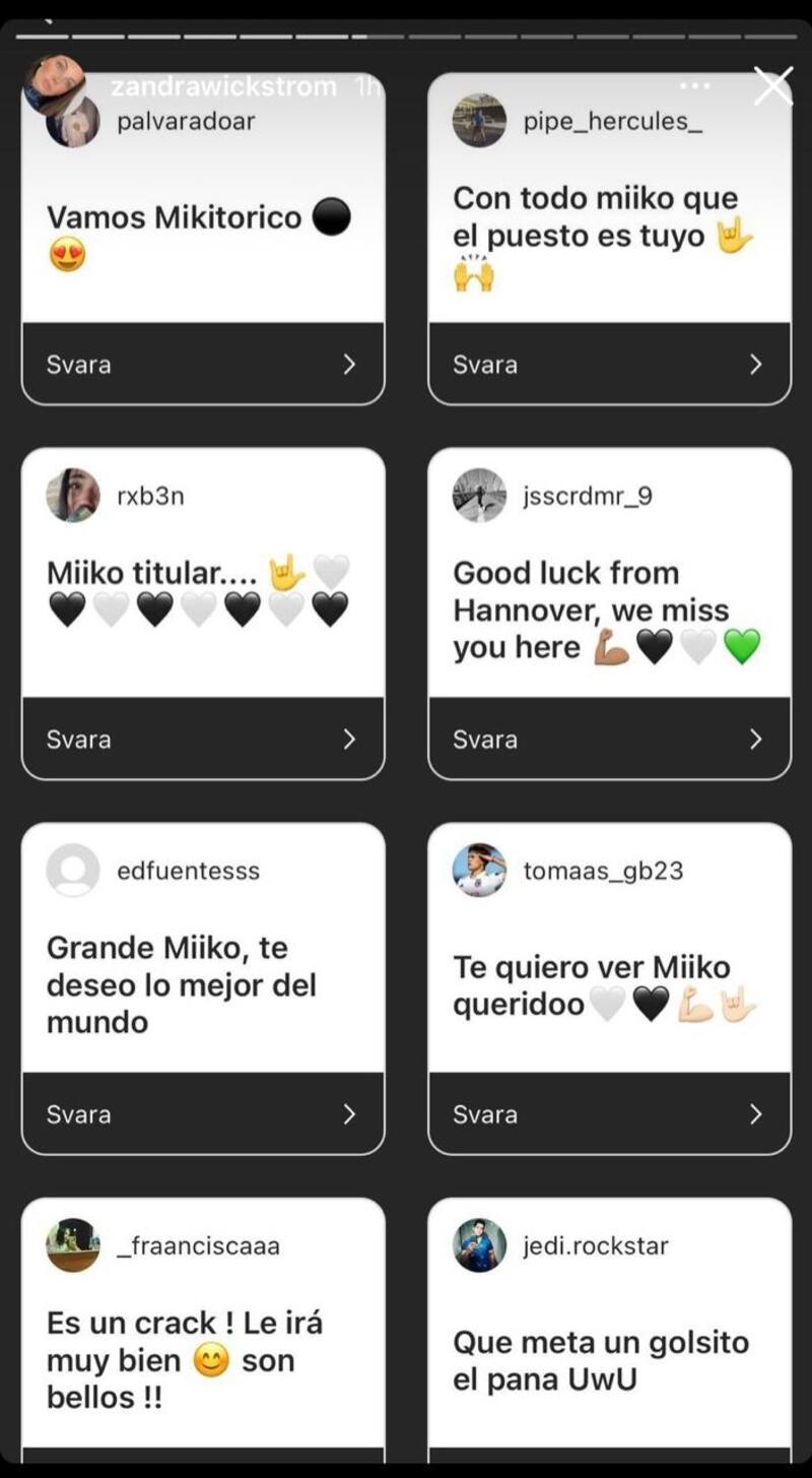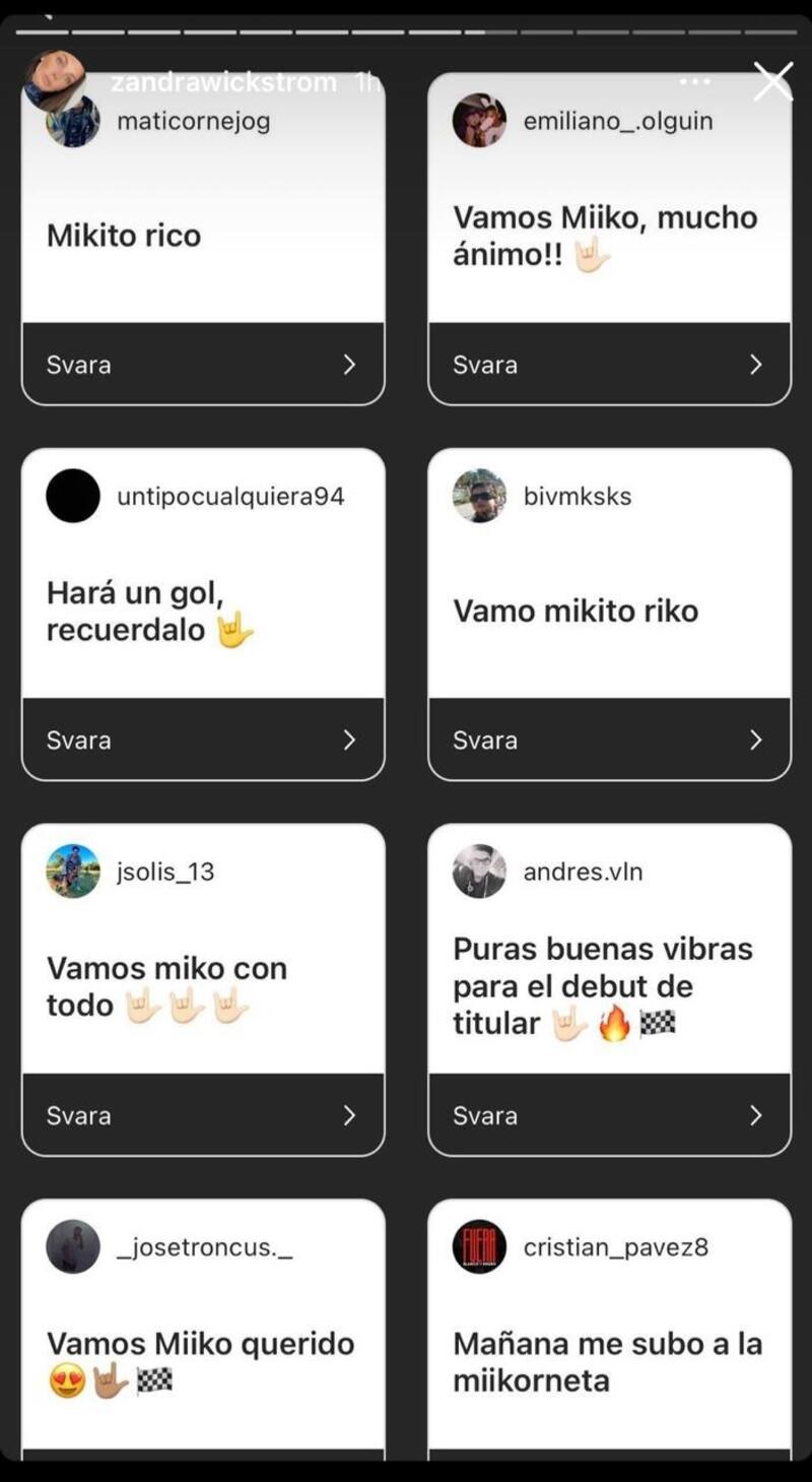 En una historia de Instagram, la joven publicó una foto de ellos junto a una caja preguntas "Envía un saludo de buena suerte a Miiko", escribió. Allí le comenzaron a llegar los comentarios de los hinchas. "Con todo Miiko que el puesto es tuyo", "Dale Miiko, queremos verte con más minutos en Colo Colo", "Buenas vibras para el debut de titular", "Suerte Miiko, ojalá le quites el puesto al malo de Suazo" y "A salir con todo, es tu oportunidad para demostrar lo crack", fueron algunos de los mensajes que le llegaron.