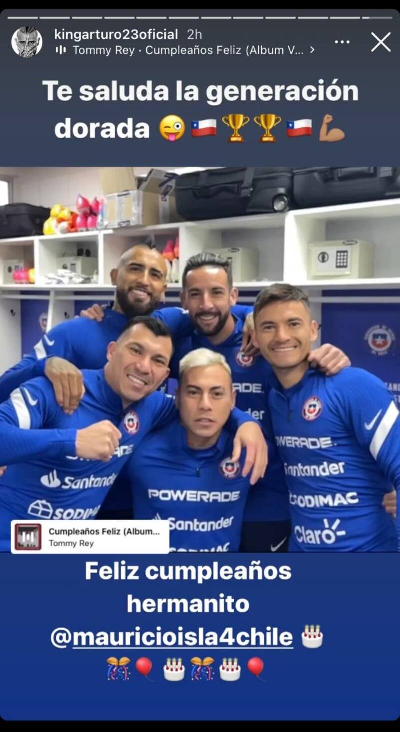 En su cuenta de Instagram, Arturo Vidal, compartió una fotografía junto a sus compañeros para desearle un buen día al "Huaso". "Te saluda la generación dorada", escribió junto a la captura y unos emojis de copas. "Feliz cumpleaños hermanito", continuó. Además, el "King" decidió añadirle la canción de 'Cumpleaños feliz' de Tommy Rey.