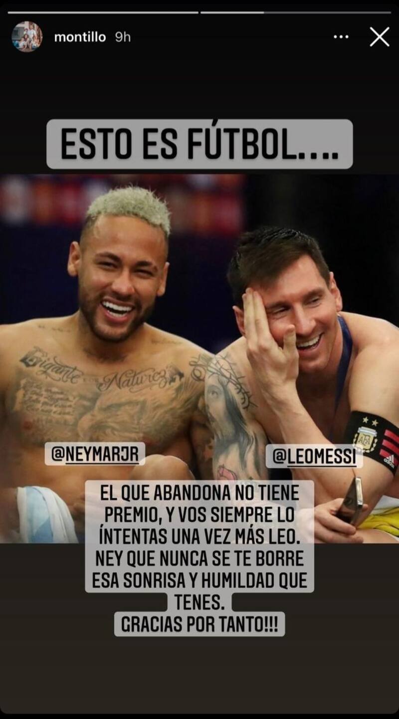 En su cuenta de Instagram, el ex futbolista subió una imagen a sus historias, donde aparecen los dos jugadores en el vestuario, compartiendo tras el fin del torneo, pese a la victoria de Argentina sobre Brasil. "Esto es el fútbol, el que abandona no tiene premio, y voz siempre lo intentas una vez más, Leo. Ney, que nunca se te borre esa sonrisa y humildad que tienes. ¡Gracias por tanto!", escribió sobre la escena, donde etiquetó a los dos astros del fútbol.