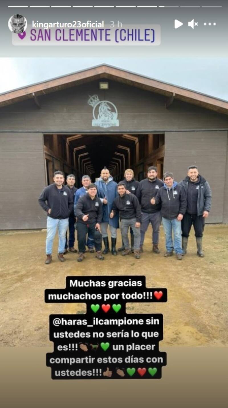 "Muchas gracias muchachos por todo. 'Haras Il Campione' sin ustedes no sería lo que es. Un placer compartir estos días con ustedes", escribió el formado en Colo Colo en su cuenta de Instagram, donde publicó una historia con la imagen de los trabajadores que hicieron posible su sueño.