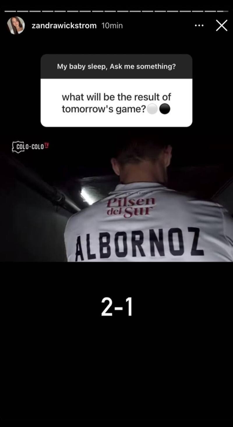 En la tarde de este sábado, Zandra Wickström, novia del jugador de Colo Colo, Miiko Albornoz, compartió en sus redes sociales algunas preguntas que le enviaron sus seguidores en Instagram y apostó al resultado que obtendrá el cuadro "Albo" en Copa Chile.