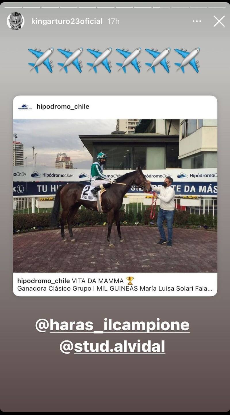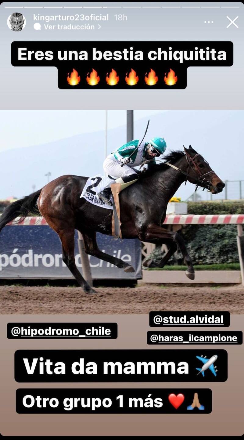 "Vita da Mamma", se llama la yegua de Arturo que ganó ayer en el Grupo 1 de las carreras realizadas en el Hipódromo Chile. "Eres una bestia chiquita", escribió el jugador del Inter de Milán junto a una imagen del animal en la competencia.