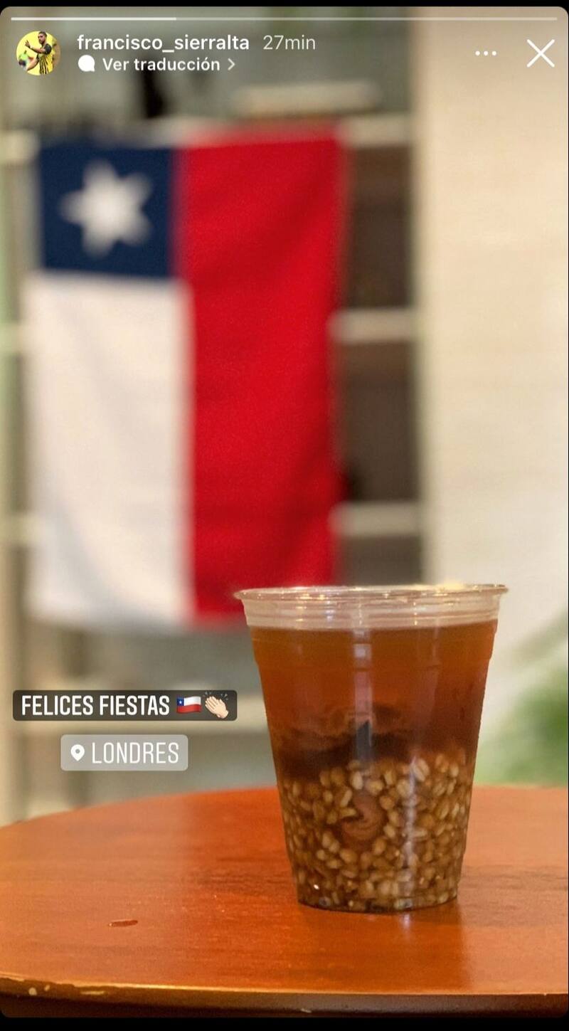 El formado en Universidad Católica compartió en su cuenta de Instagram una fotografía donde aparece un mote con huesillo con la bandera chilena de fondo. "Felices fiestas", escribió y agregó Londres como ubicación. También, su pareja María Paula Arnold publicó un video donde aparecen los dos bailando la tradicional cueca del "Guaton Loyola" y una captura de empanadas con pebre. "Feliz cumple Chile", escribió en su posteo.