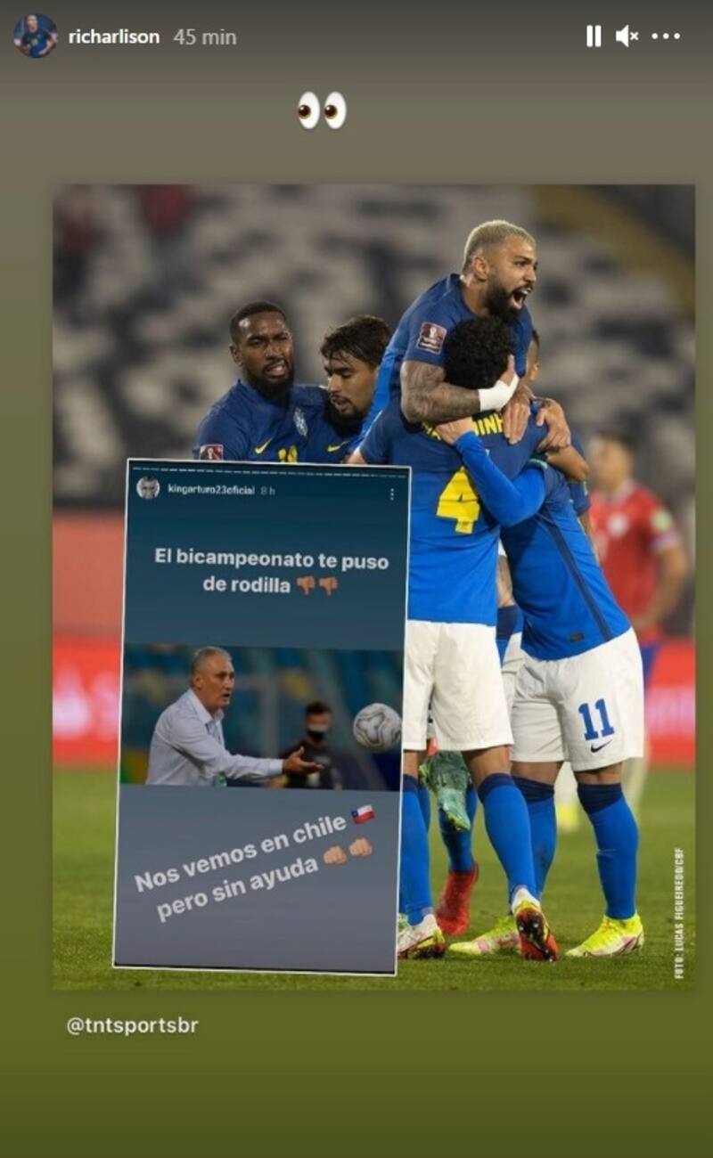 Tras el duelo entre La Roja y Brasil por Copa América, donde también Chile acabó cayendo (y con polémica) por 1 a 0, Arturo Vidal subió a su Instagram una historia con una foto de "Tite" DT de la "Canarinha", con el texto "El bicampeón te puso de rodillas. Nos vemos en Chile, pero sin ayudas", registro que Richarlison guardó y recordó hoy tras el triunfo de su equipo.