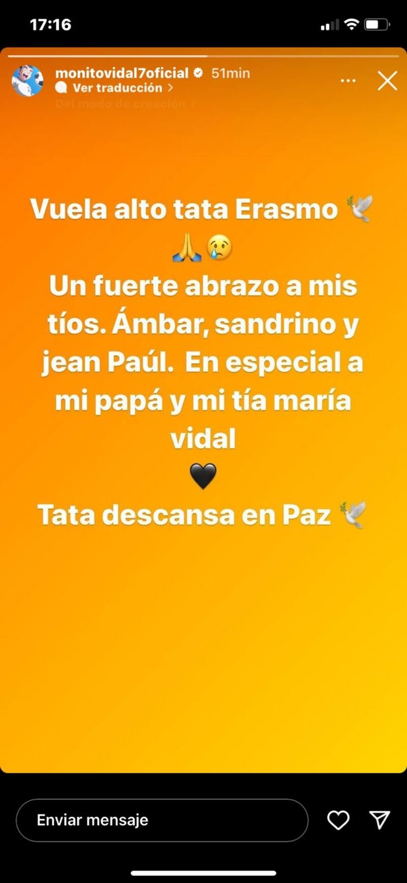 "Vuela alto tata Erasmo. Un fuerte abrazo a mis tíos Ámbar, Sandrino y Jean Paul, en especial a mi papá y mi tía María Vidal. Tata descansa en paz", publicó el ex youtuber en una de sus historias en Instagram.