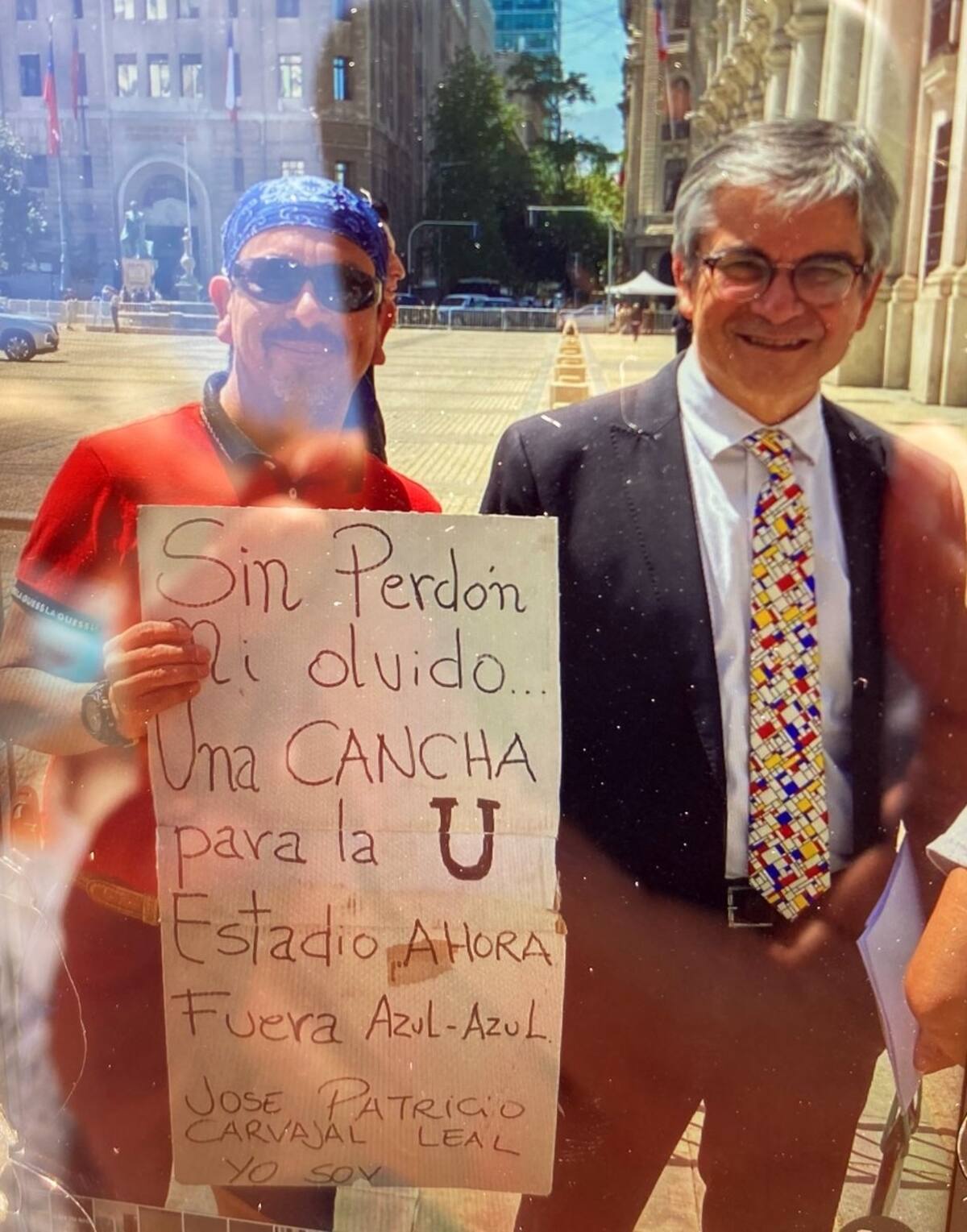 El fanático, que se identificó como José Carvajal, arribó a la salida del palacio de gobierno con un claro mensaje, el que quedó inmortalizado en la foto que se tomó junto al ministro de Hacienda, Mario Marcel. "Sin perdón ni olvido. Una cancha para la U, estadio ahora. Fuera Azul Azul", se pudo leer en la misiva.