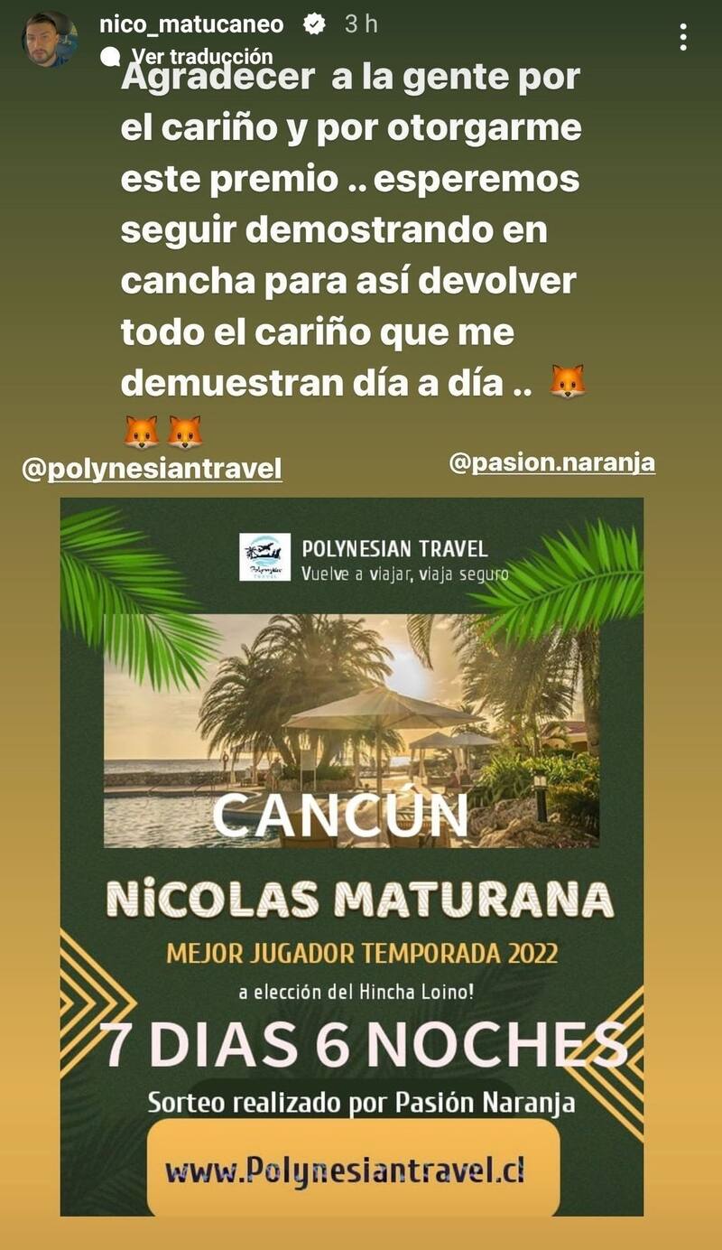 La agrupación de hinchas Pasión Naranja, a través de una votación realizada por los hinchas en Instagram, designó a Maturana como el mejor jugador de la destacada campaña de los "Zorros", y por esto, fue premiado con una estadía de siete días y seis noches en Cancún para pasar sus vacaciones.