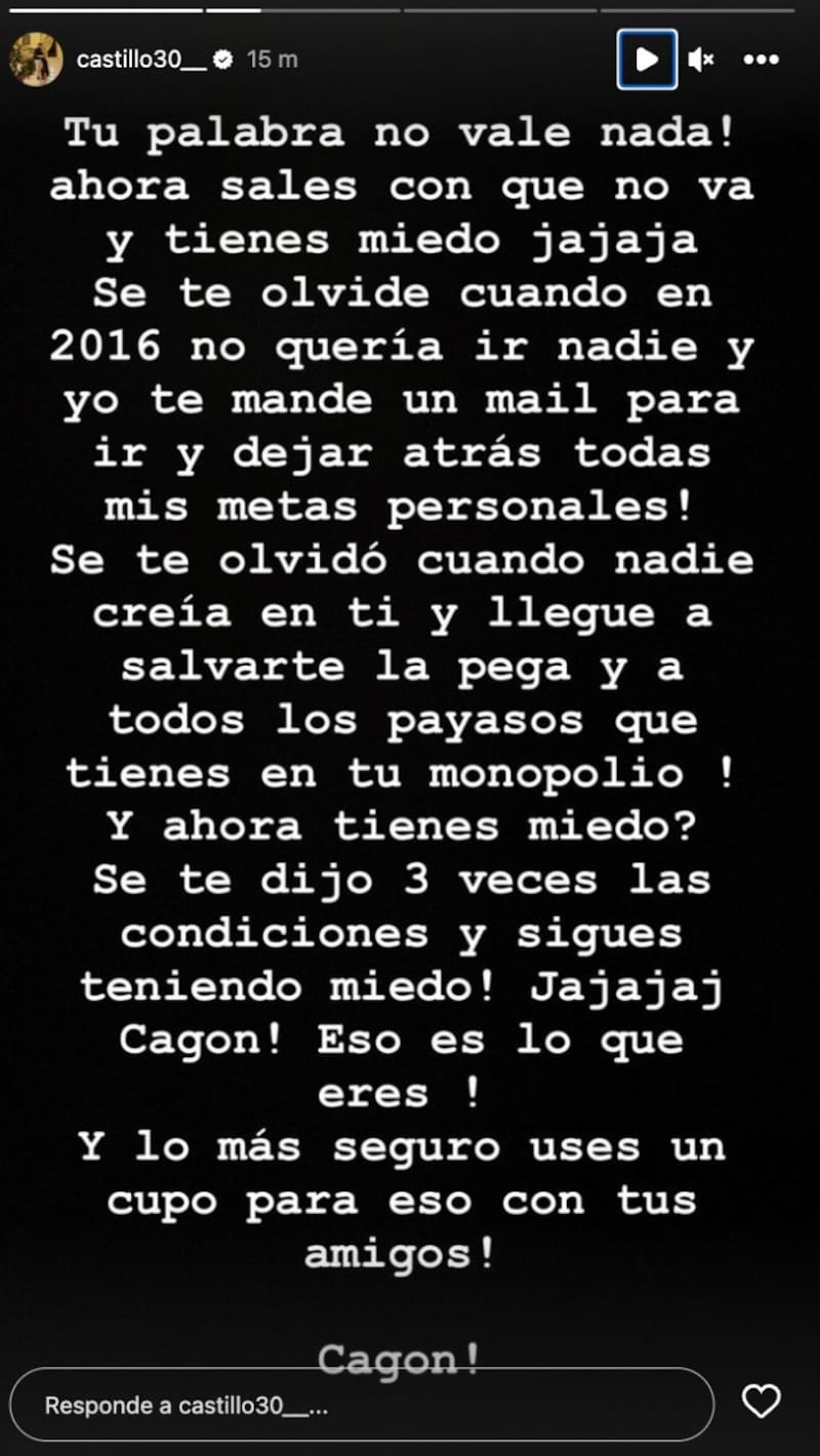 "Ni por un peso hemos hablado y tienes miedo. Créeme que por lo que menos juego ahora es por eso. Pero decidiste tener miedo. ¿Volver? ¡Difícil contigo ahí. ¡Gracias, cagón!”, cierra el mensaje de Castillo.