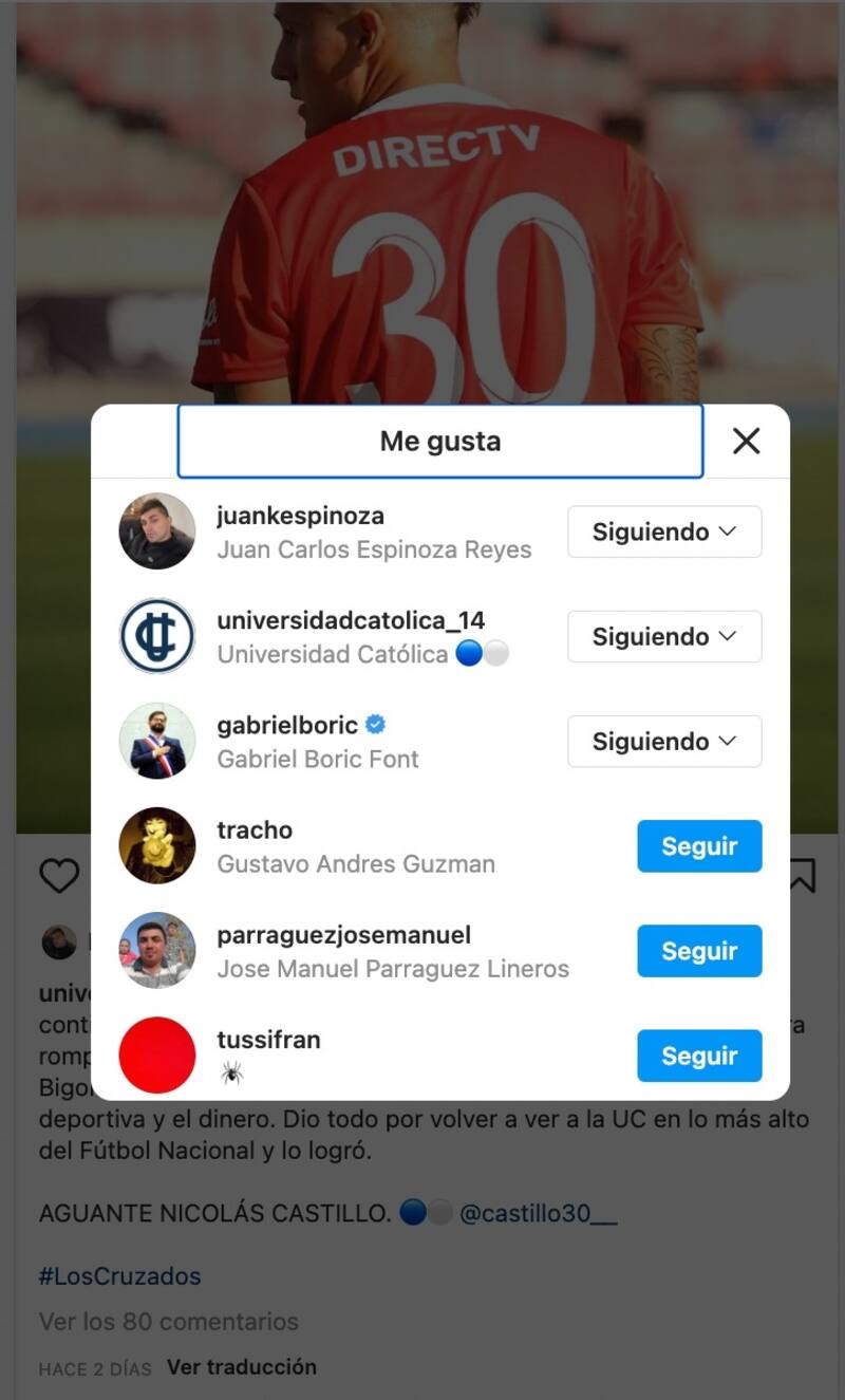 "Jugando en Italia y con varias opciones de continuar su carrera en Europa, eligió volver a Católica en 2016 para romper la mala racha y lo consiguió, consagrándose bicampeón y bigoleador. Puso primero a la UC antes que el futuro de su carrera deportiva y el dinero. Dio todo por volver a ver a la UC en lo más alto del fútbol nacional y lo logró", detallaba el post en apoyo a Castillo que recibió el "like" de Gabriel Boric.