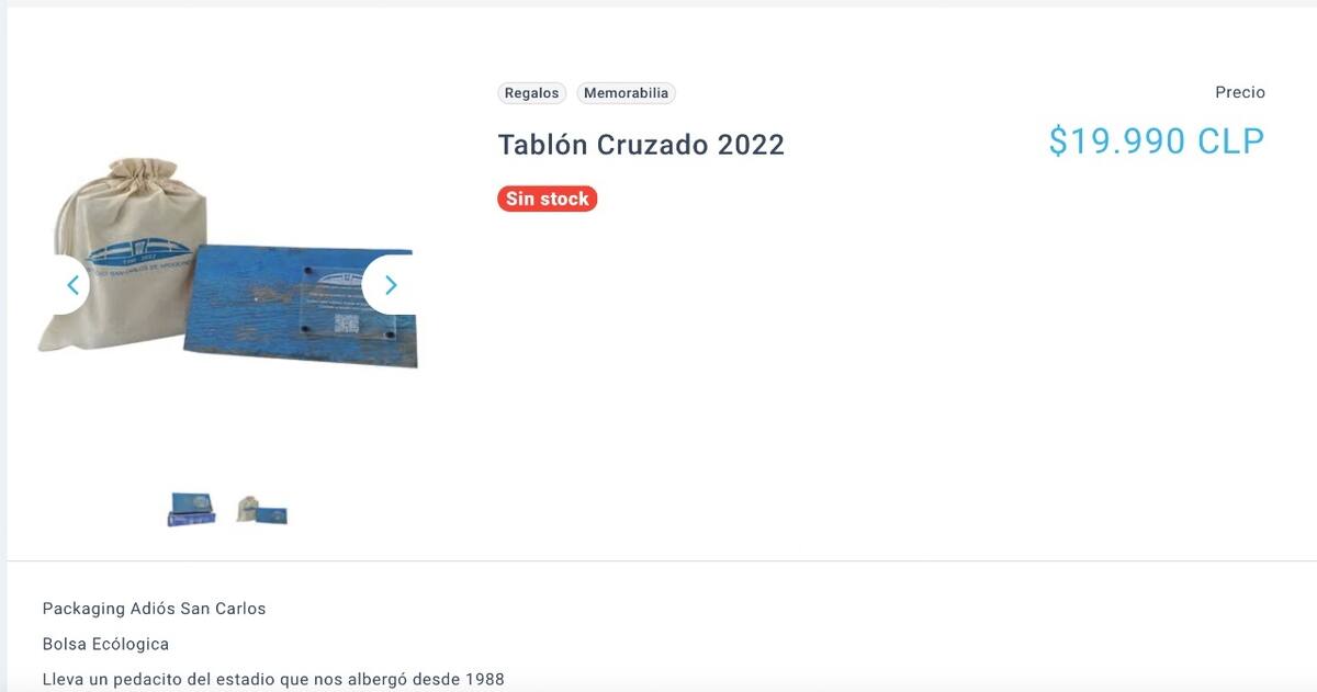 A través de su página oficial, la UC lanzó a la venta los tablones de lo que quedó de San Carlos de Apoquindo luego de los incidentes ante Audax Italiano por Copa Chile. Los forofos precordilleranos pudieron acceder por $19.990 a lo que llamaron el "Tablón Cruzado 2022" y que duró 20 minutos en stock.