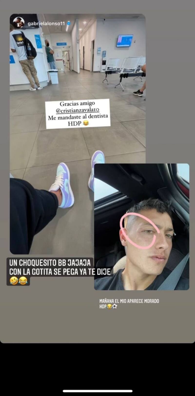"Gracias amigo Cristián Zavala, me mandaste al dentista", escribió el lateral izquierdo acompañada de una foto en el recinto médico. La respuesta del extremo, no se hizo esperar y le indicó que él también terminó con algún problema. "Un choquecito, jajaja. Con la gotita se pega, ya te dije. Mañana el mío aparece morado", mostrando el pómulo.
