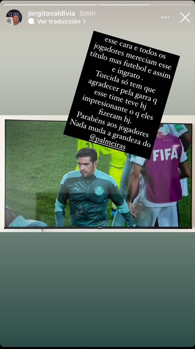 "Este tipo y todos los jugadores se merecían ese título pero el fútbol es así de ingrato", comenzó escribiendo en su cuenta de Instagram, sobre una fotografía donde aparece Abel Ferreira, el entrenador del club. "Los fanáticos sólo tienen que agradecer la determinación que tuvo este equipo hoy. Impresionante lo que hicieron. Felicidades a los jugadores, nada cambia la grandeza del Palmeiras", terminó.