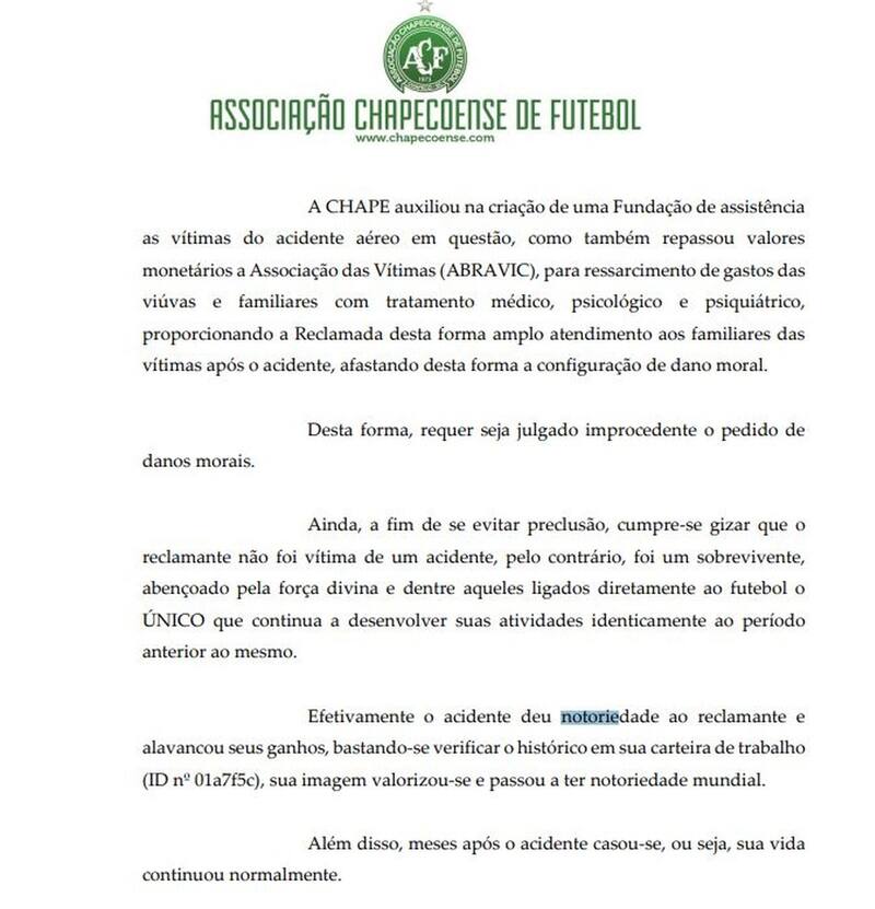 "Hay que señalar que el reclamante no fue víctima de un accidente, al contrario, fue un sobreviviente, bendecido por la fuerza divina y, entre los directamente vinculados al fútbol, el ÚNICO que continúa desarrollando actividades de manera idéntica al período anterior", señalaron desde Chapecoense.