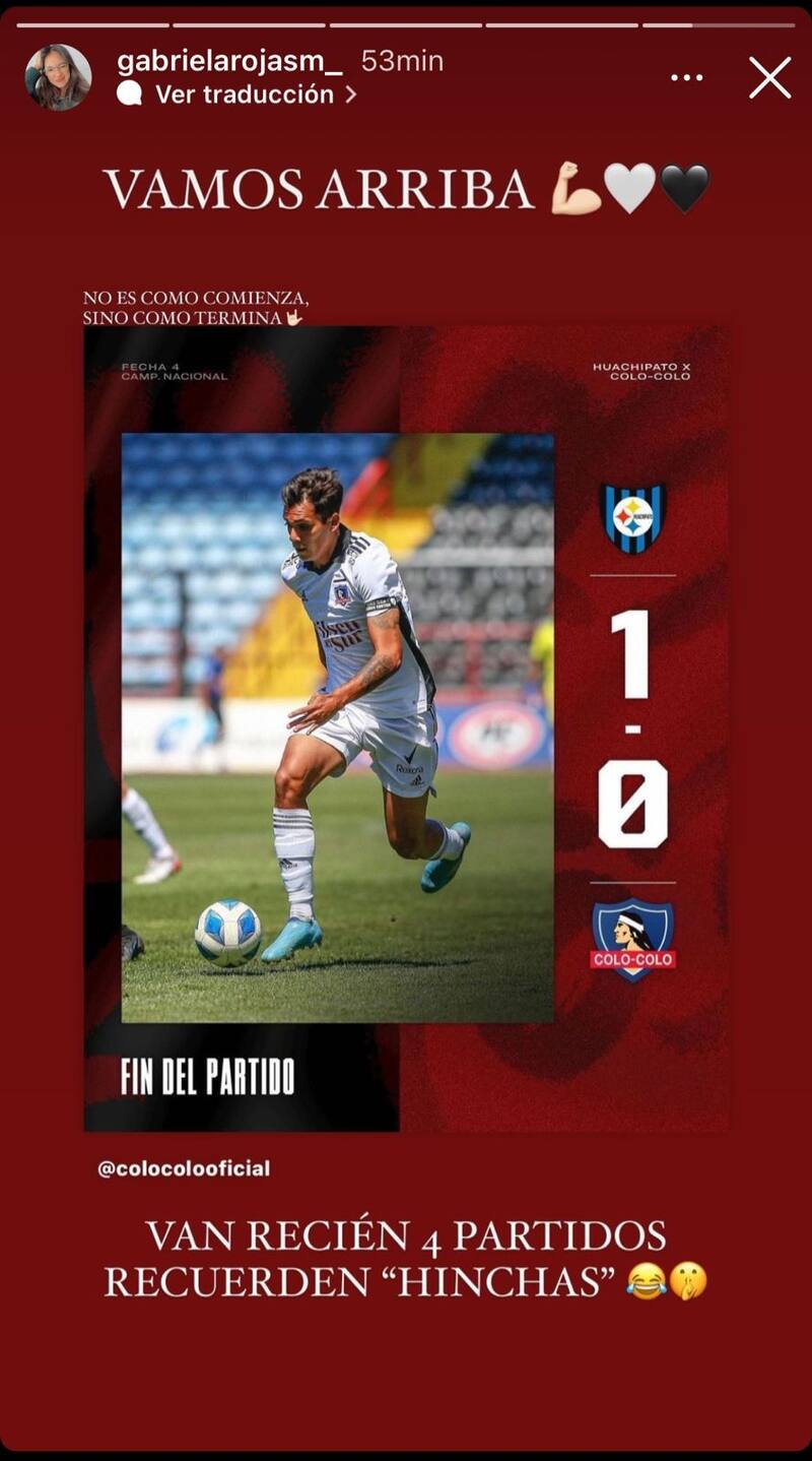 "No es como comienza, sino como termina", escribió Gabriela Rojas en su cuenta de Instagram, sobre una fotografía con el resultado del encuentro. "Van recién 4 partidos, recuerden 'hinchas'", escribió más abajo junto a un sticker de cara sonriendo y uno haciendo gesto de silencio, cuestionando a los que se hacen llamar fanáticos albos pero que solo critican.