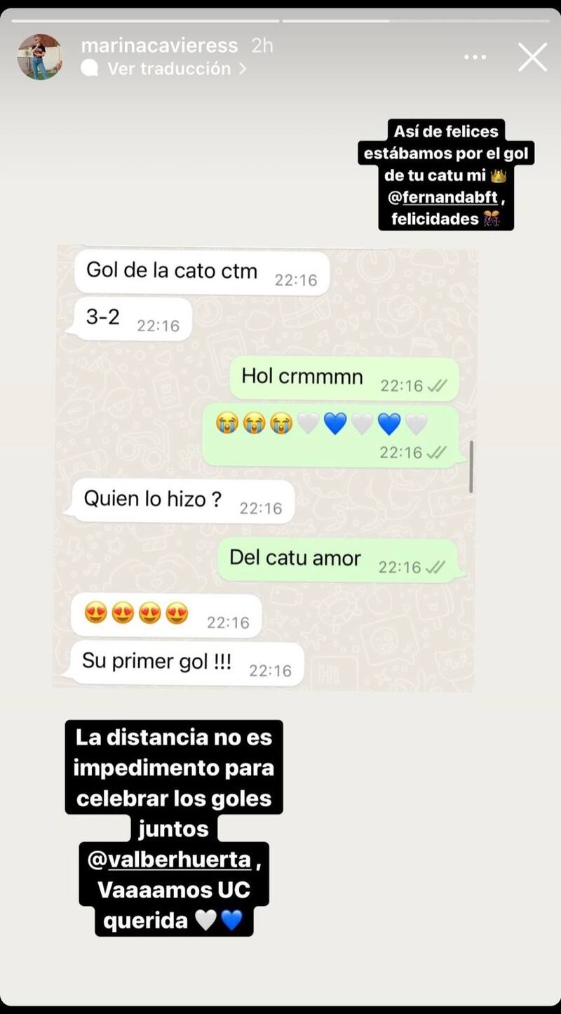 Marina Cavieres, esposa de Huerta, compartió parte del chat entre ambos por Whatsapp, donde celebraban el primer gol del "Catuto". "¿Quién lo hizo?", le preguntó el jugador a su mujer y ella le contestó que Rebolledo anotó. "¡Su primer gol!", respondió Valber Huerta junto a emojis de cara con corazones.