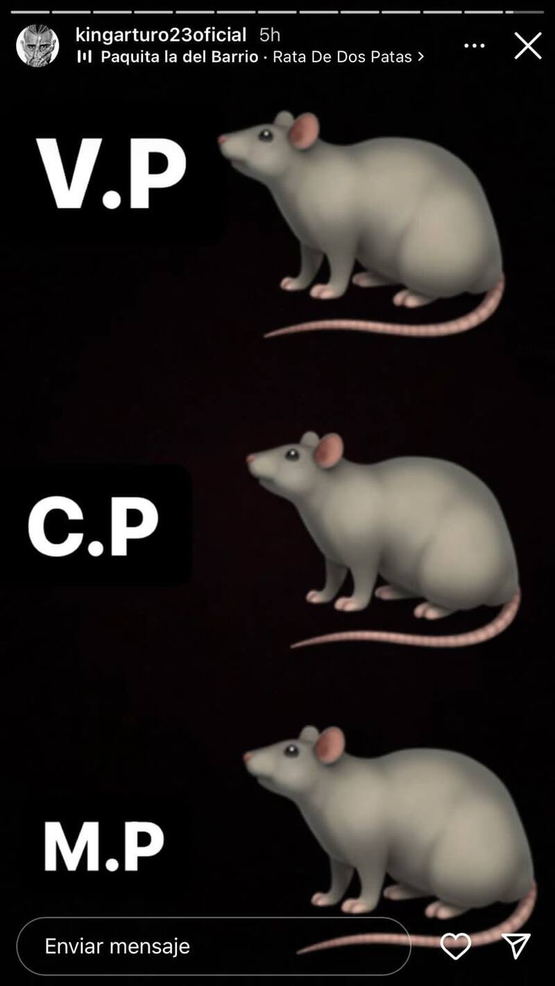 Sin precedentes, Arturo Vidal lanzó el enigmático mensaje en su Instagram, en la que enlista tres posibles identidades: V.P, C.P y M.P. En la misma línea de estas iniciales en clave, el volante de Inter de Milán puso tres ratas y acompañó la historia con la reconocida canción "Rata de dos patas" de Paquita la del Barrio.