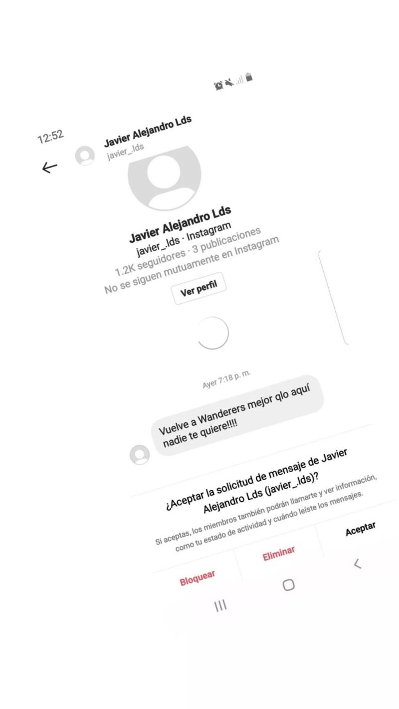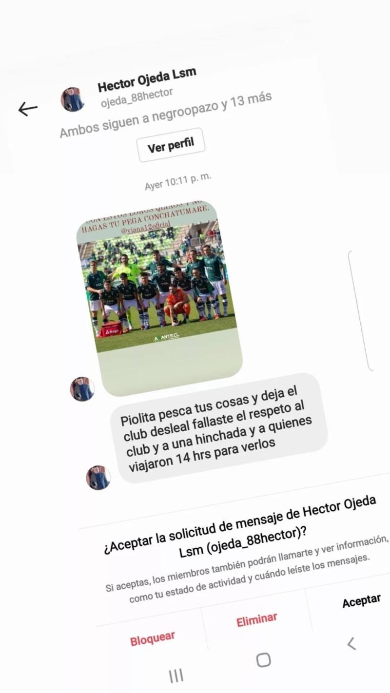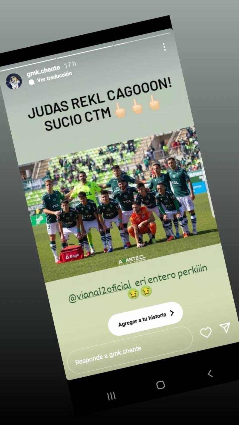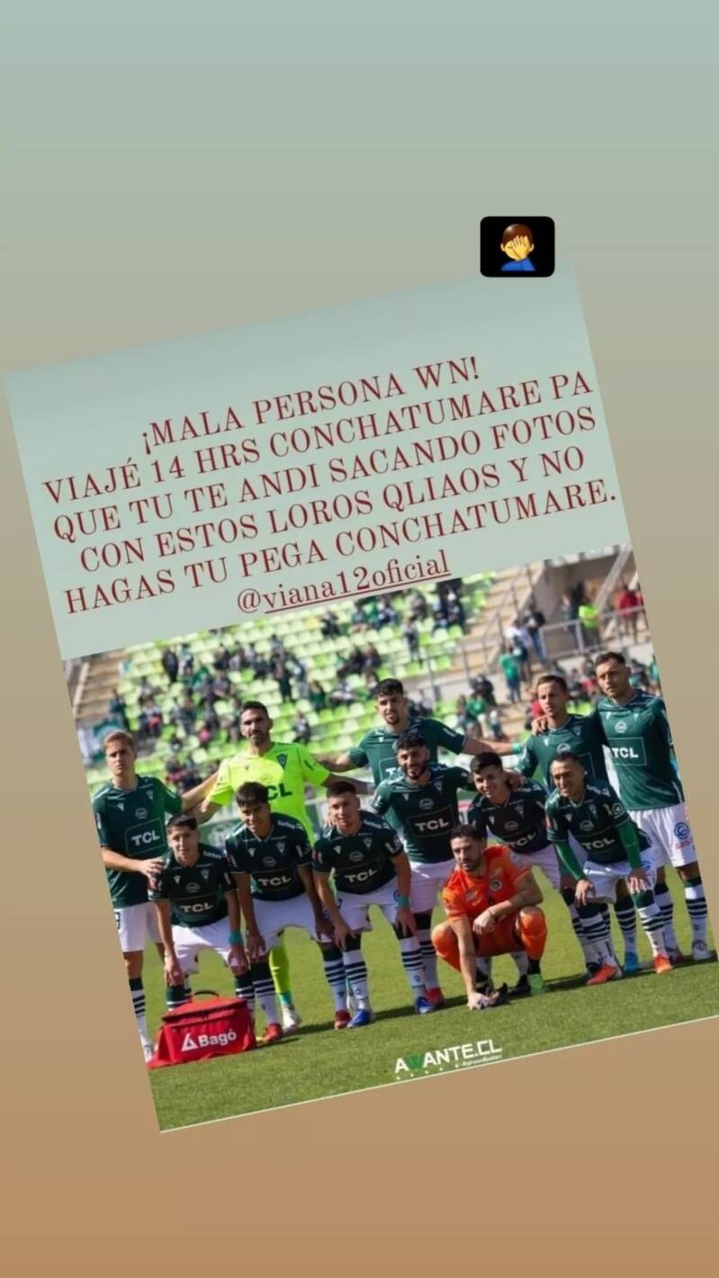 "Que pena que estos 'choros' de redes sociales ensucien una foto llena de respeto y cariño...en las historias siguientes los 'choros jajaja" (sic) escribió Viana antes de proceder a dar a conocer los insultos y amenazas que recibió donde incluso, lo trataron de "Judas" y que no respetaba a los hinchas que viajaron más de 14 horas para alentar a su equipo en Valparaíso.