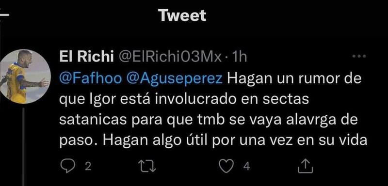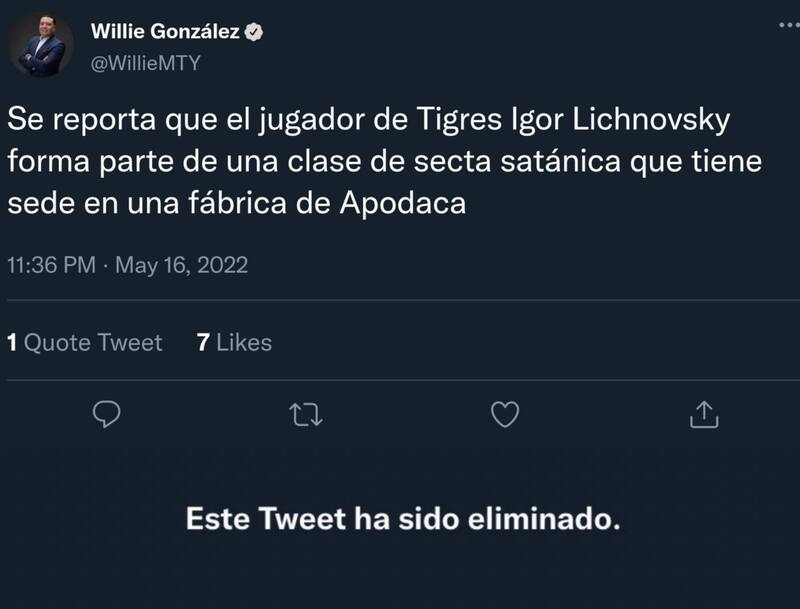 Sin corroborar la noticia, el periodista mexicano Willie González cayó en la perversa iniciativa de los hinchas de Tigres y publicó la información a través de su Twitter personal. "Se reporta que el jugador de Tigres, Igor Lichnovsky, forma parte de una secta satánica que tiene sede en una fábrica de Apodaca", detalló el comunicador.