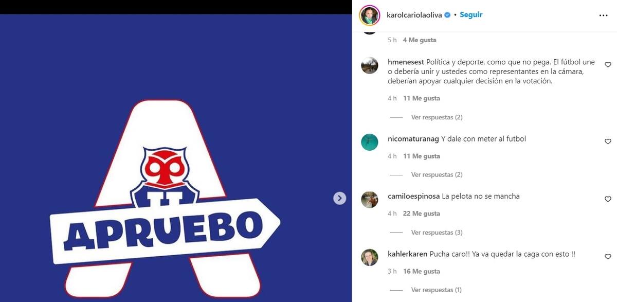 Karol Cariola, diputada y coordinadora del comando del Apruebo, realizó la publicación en redes sociales, generando comentarios divididos. A menos de un mes para el "Plebiscito Constitucional de Salida", que se realizará el domingo 4 de septiembre, se instaló una polémica en la campaña del Apruebo, ya que Karol Cariola promovió votar por está opción utilizando imágenes de los escudos de los equipos del fútbol chileno.