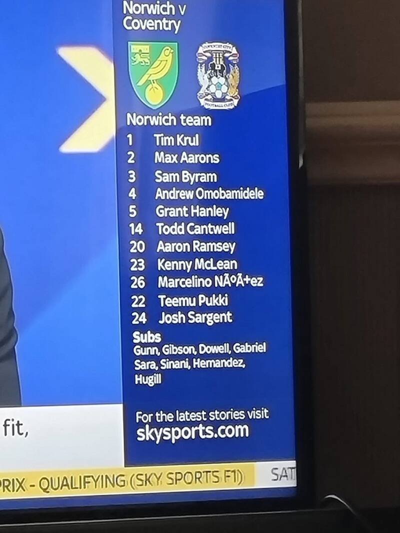 Marcelino Núñez sigue haciendo sufrir a los medios ingleses. El volante chileno formado en la UC se lució nuevamente este sábado en el triunfo del Norwich sobre Coventry en la Championship con una delicada asistencia para la apertura de la cuenta, pero la TV británica todavía se complica con su apellido, ya que en el idioma inglés la letra "Ñ" no existe.