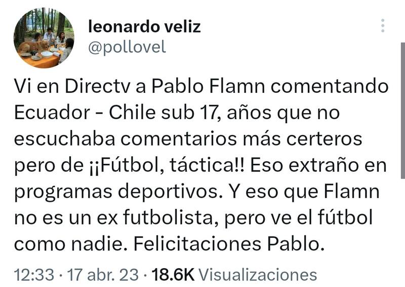 “Vi en Directv a Pablo Flamn comentando Ecuador-Chile sub 17, años que no escuchaba comentarios más certeros, pero de ¡¡Fútbol, táctica!! Eso extraño en programas deportivos”, comenzó diciendo, antes de, aparentemente, pegarle un “palito” a Pinilla”.