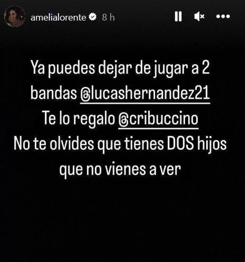 “Ya puedes dejar de jugar a dos bandas, Lucas Hernández. Te lo regalo, Cristina Buccino. No te olvides que tienes dos hijos que no vienes a ver”, escribió Amelia Lorente insinuando que su pareja tiene una relación amorosa con Cristina Buccino.