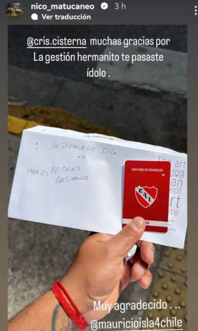 “Muchas gracias por la gestión, hermanito. Te pasaste, ídolo”, comenzó escribiendo Nicolás Maturana en agradecimiento a uno de sus amigos que hizo la gestión para recibir el ticket. En esa misma línea, el formado en la U etiquetó a Mauricio Isla y agregó: “Muy agradecido...”